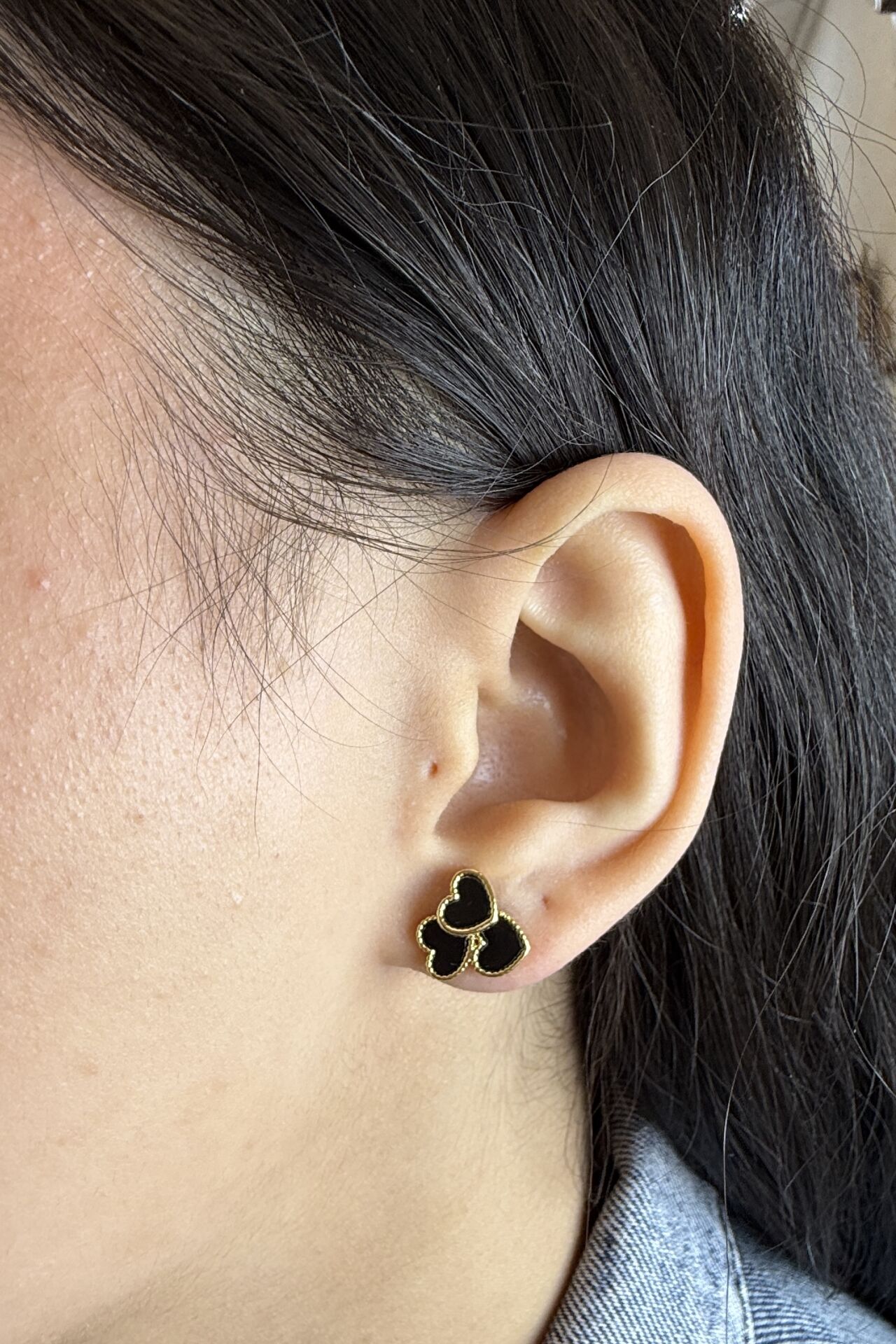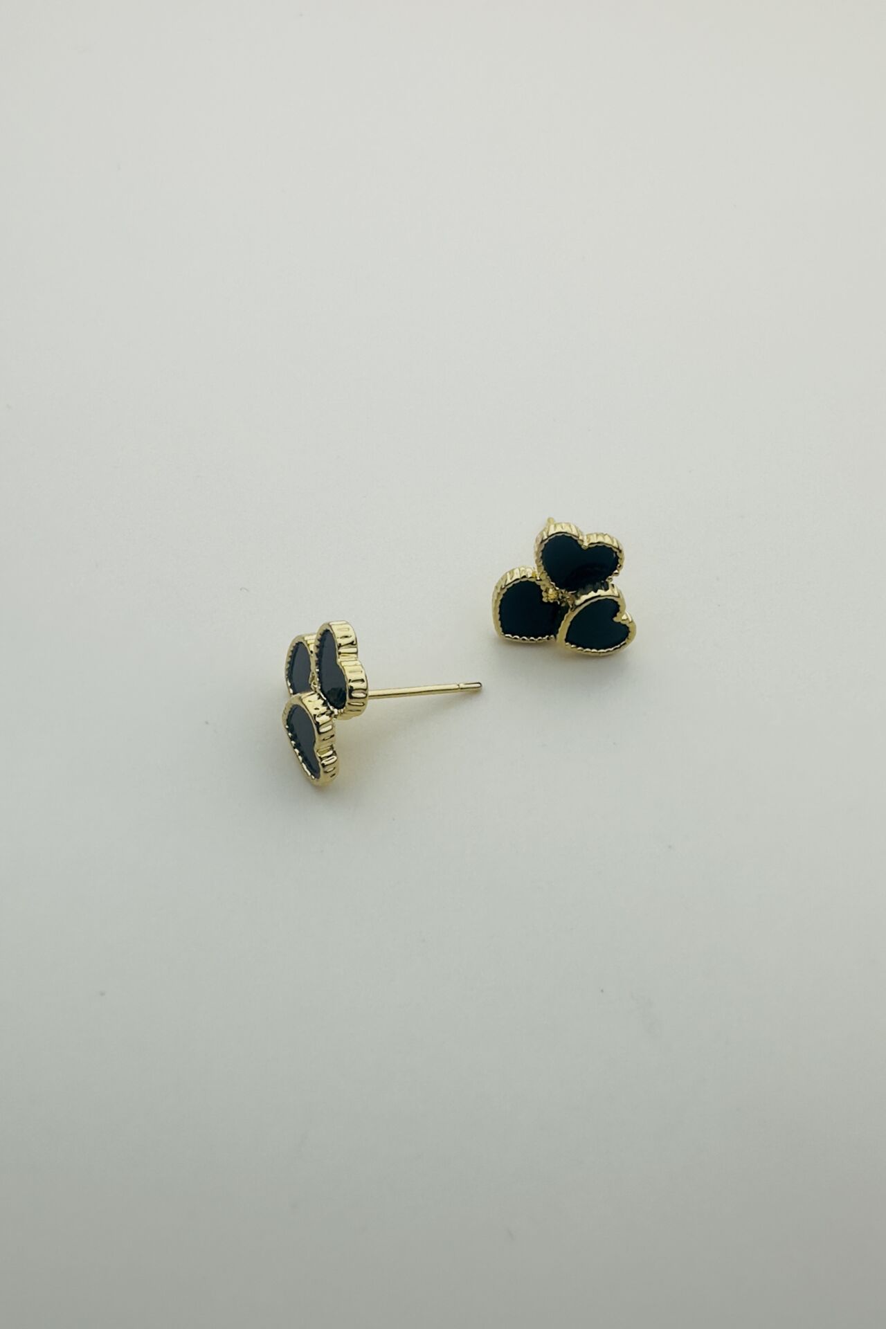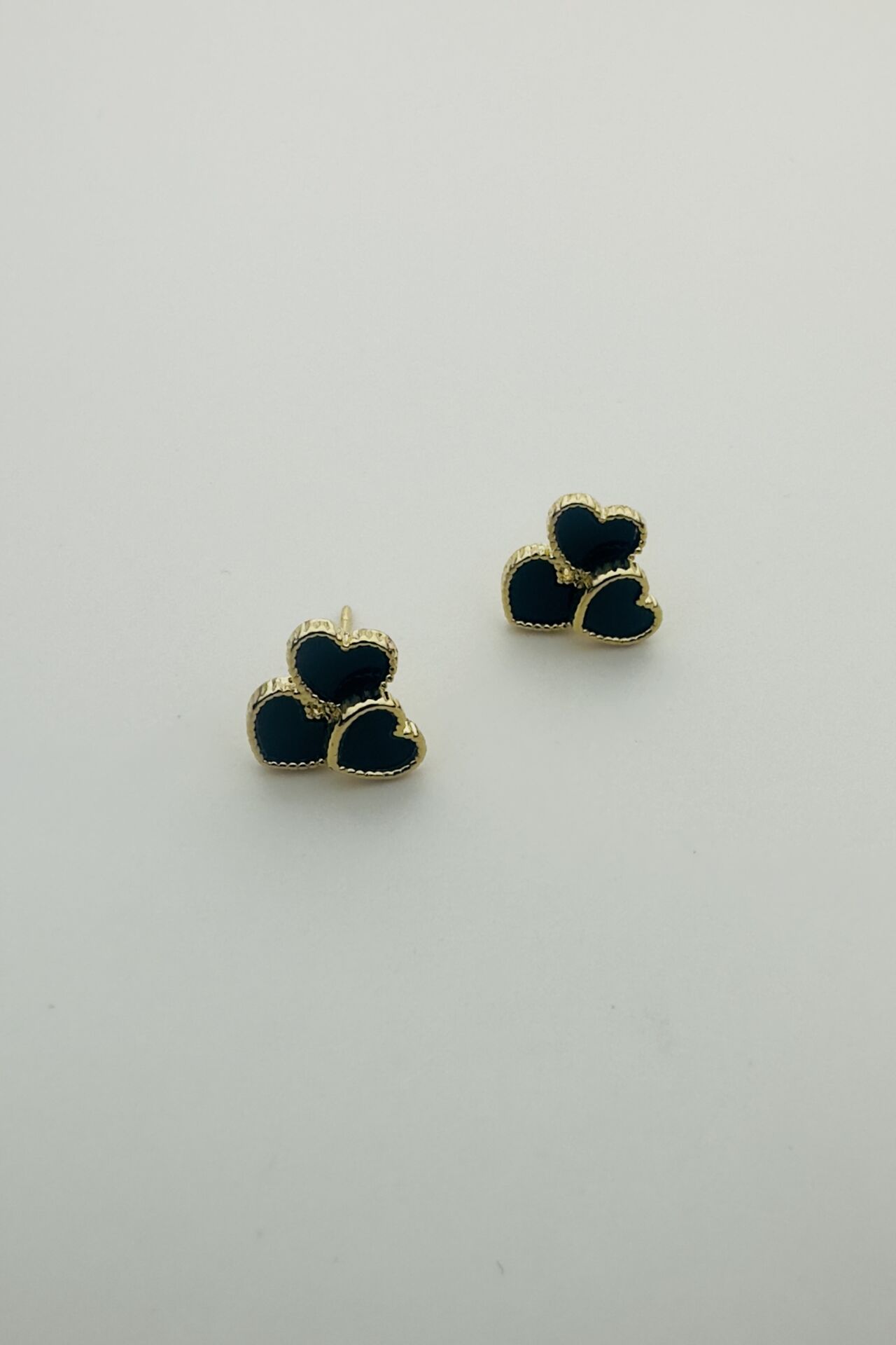 LvLv Gold Detaylı Üçlü Kalp Model Siyah Sedefli Tasarım İğne Küpe