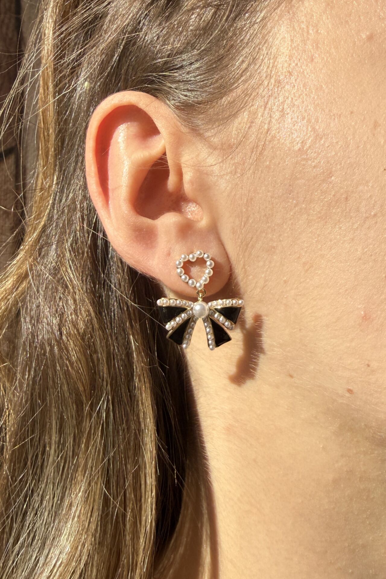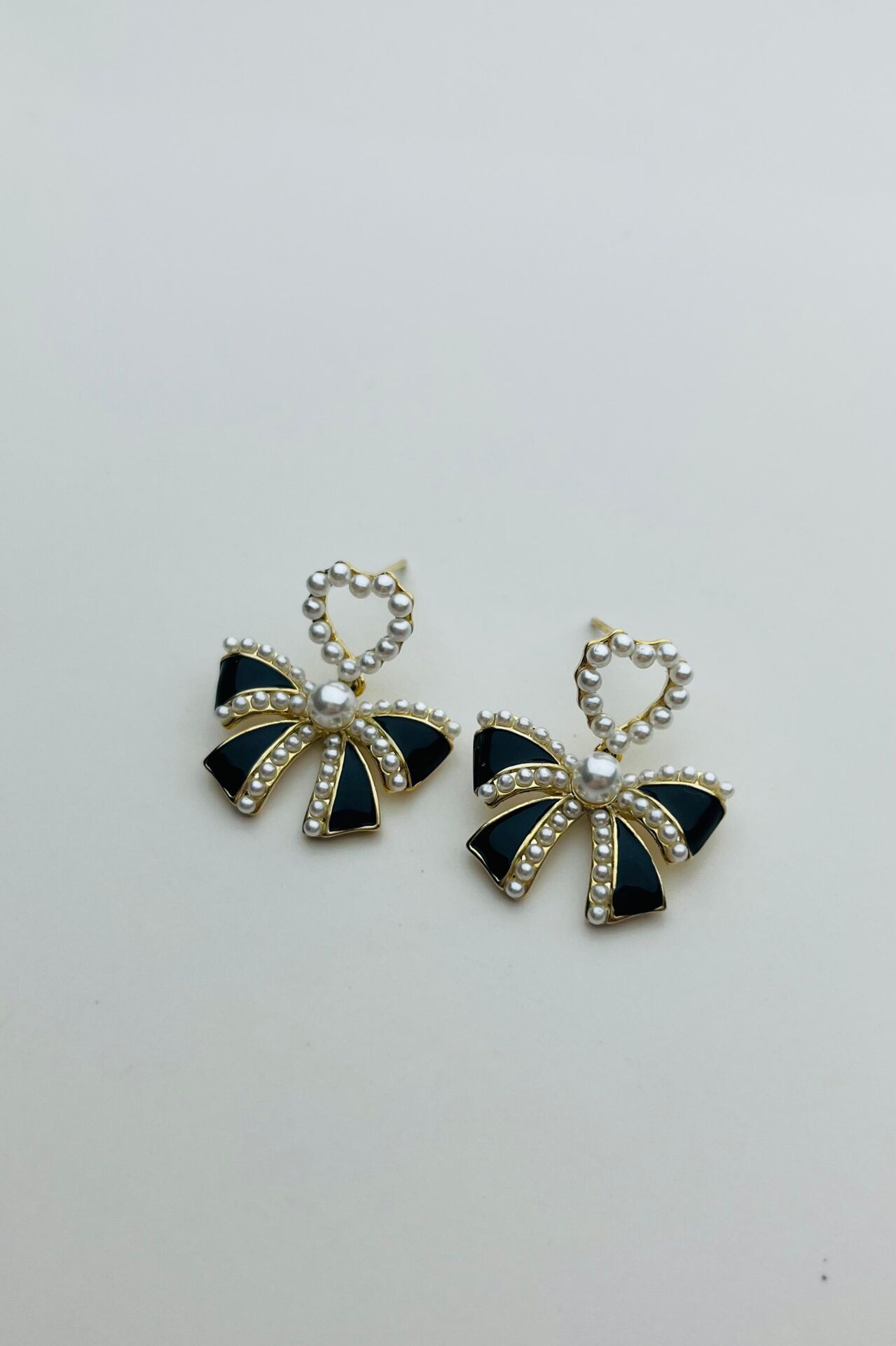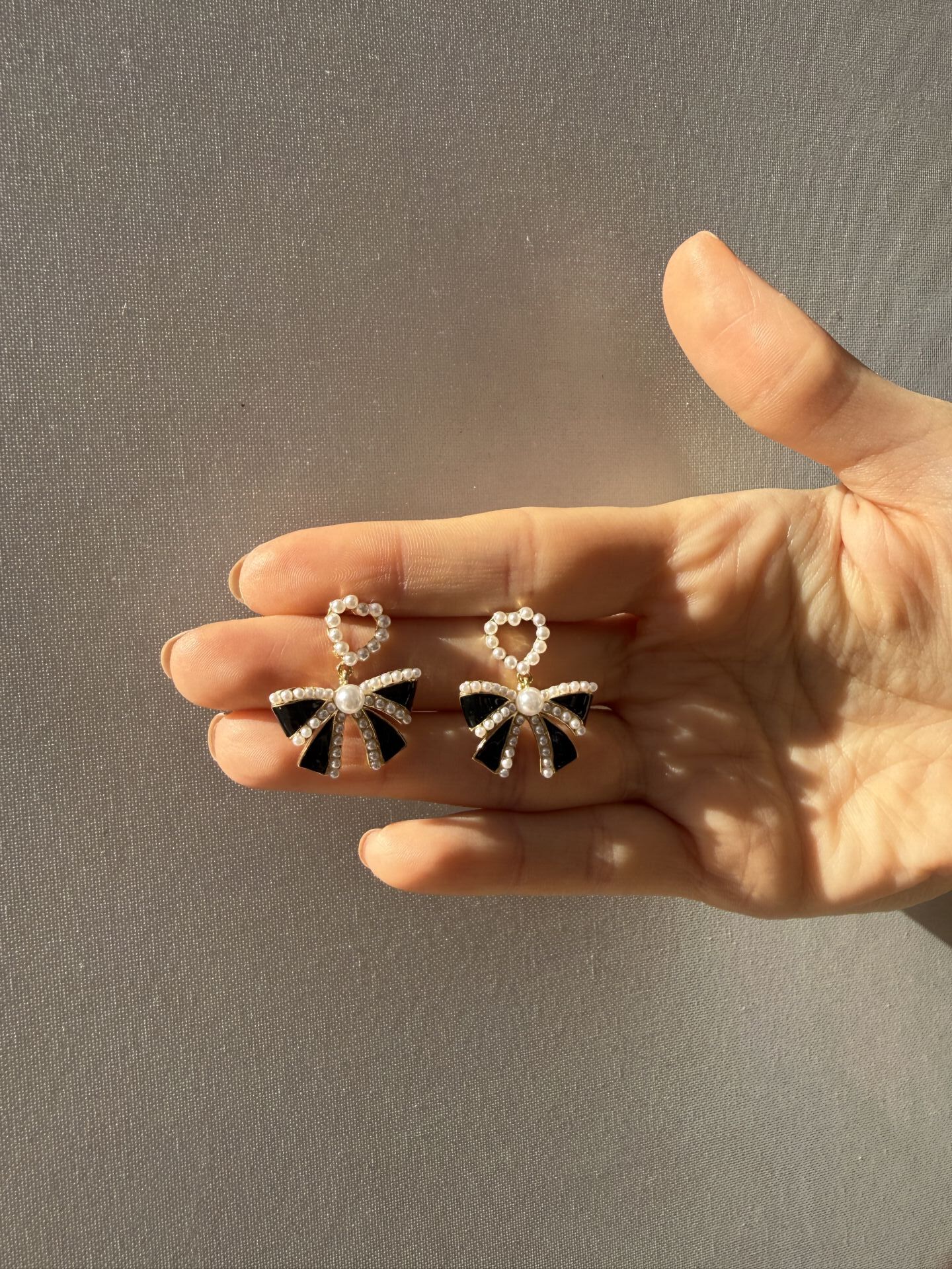 LvLv Gold Rengi İncili Kalp Detaylı Siyah Mineli Fiyonk Model Sallantılı İğne Küpe