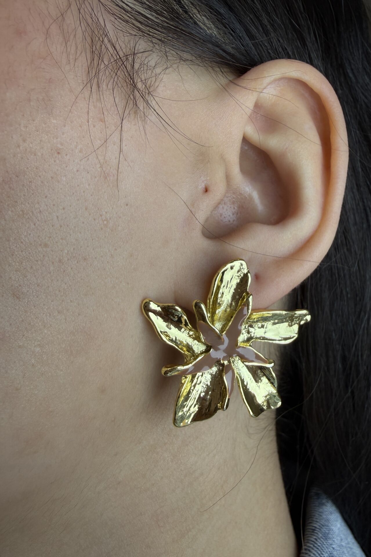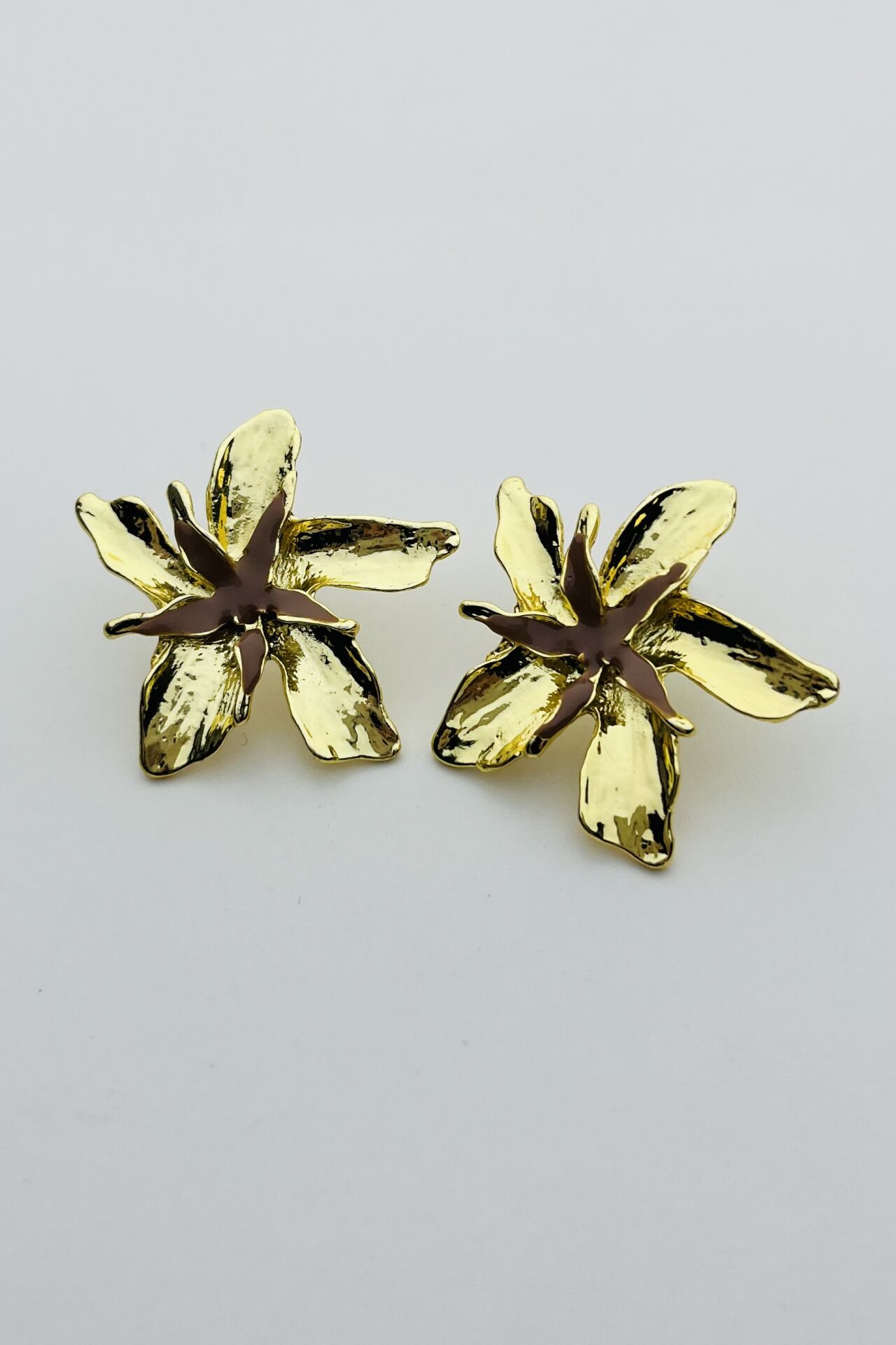 LvLv Gold Rengi Kahverengi Detaylı Çiçek Desenli İğne Küpe