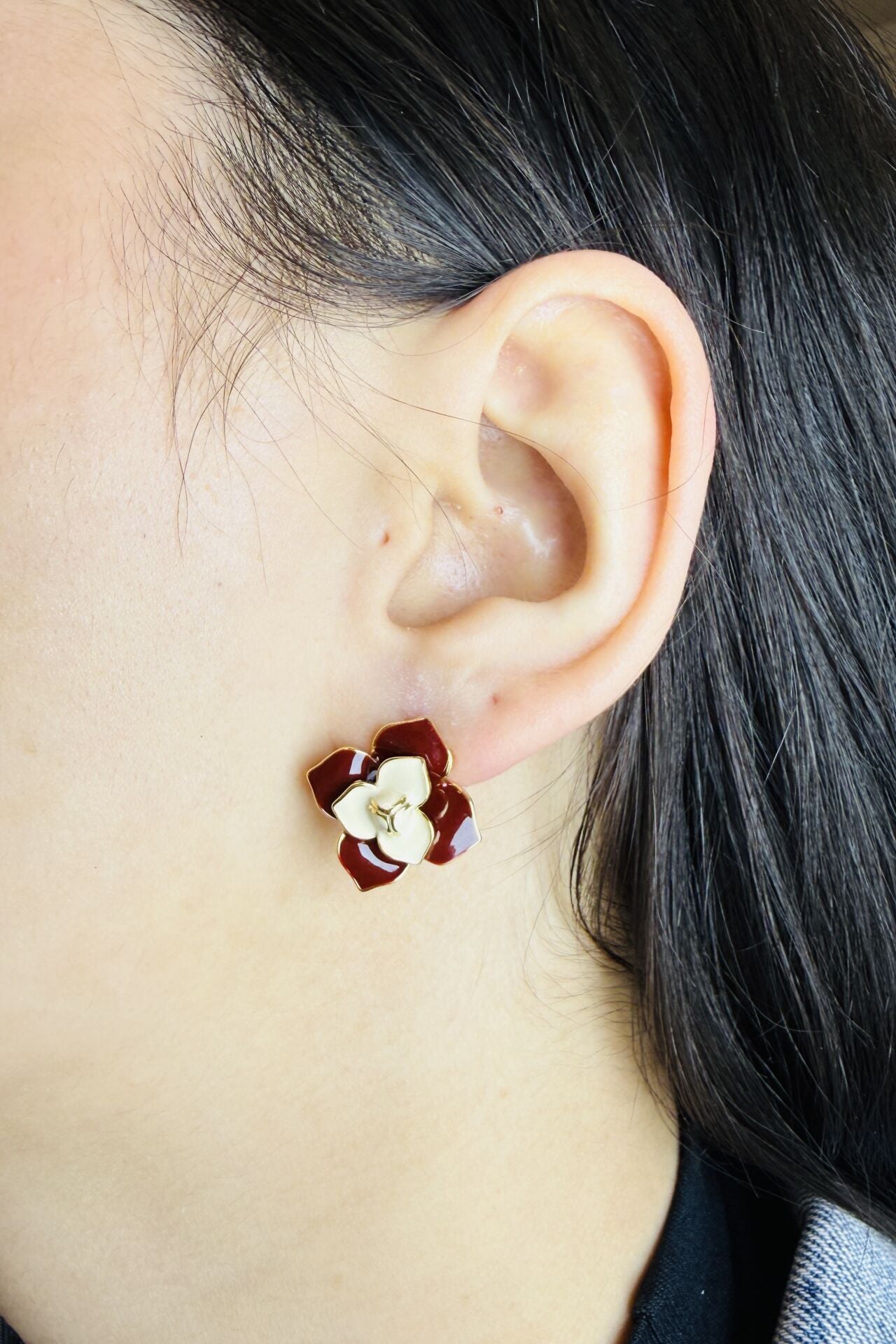LvLv Gold Rengi Kırmızı-Krem Mineli Çiçek Desenli Tasarım İğne Küpe, zarif ve şık görünümüyle her kombine kolayca uyum sağlar. Canlı renkleri ve ince işçiliği, özel günlerde veya günlük kullanımda fark yaratır. Hafif yapısı sayesinde konforlu kullanım sunar. Stilinize zarafet katmak için ideal.