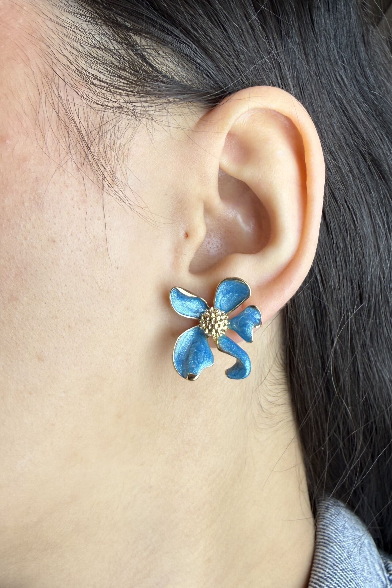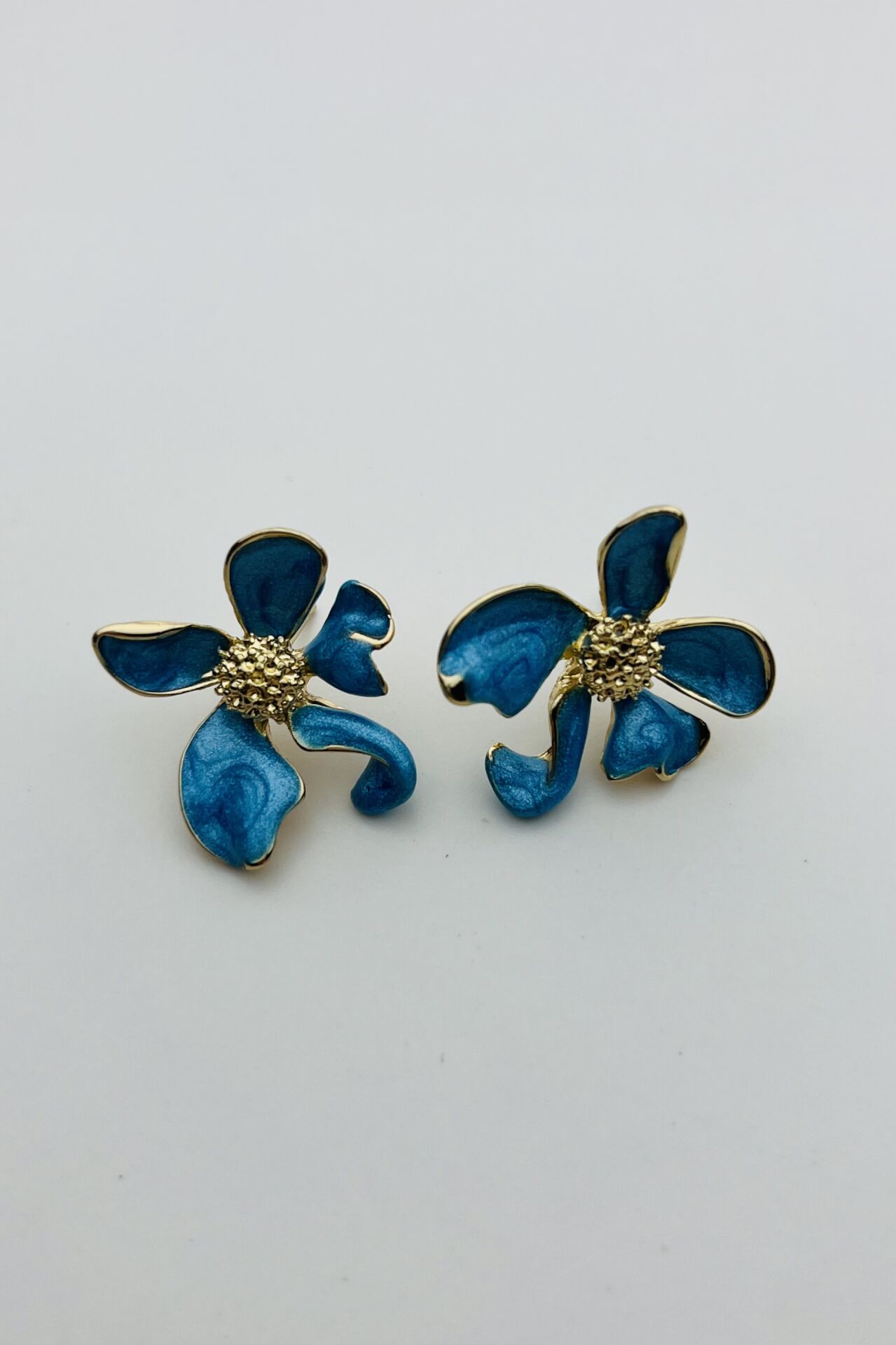 LvLv Gold Rengi Mavi Mineli Çiçek Desenli Çelik İğne Küpe