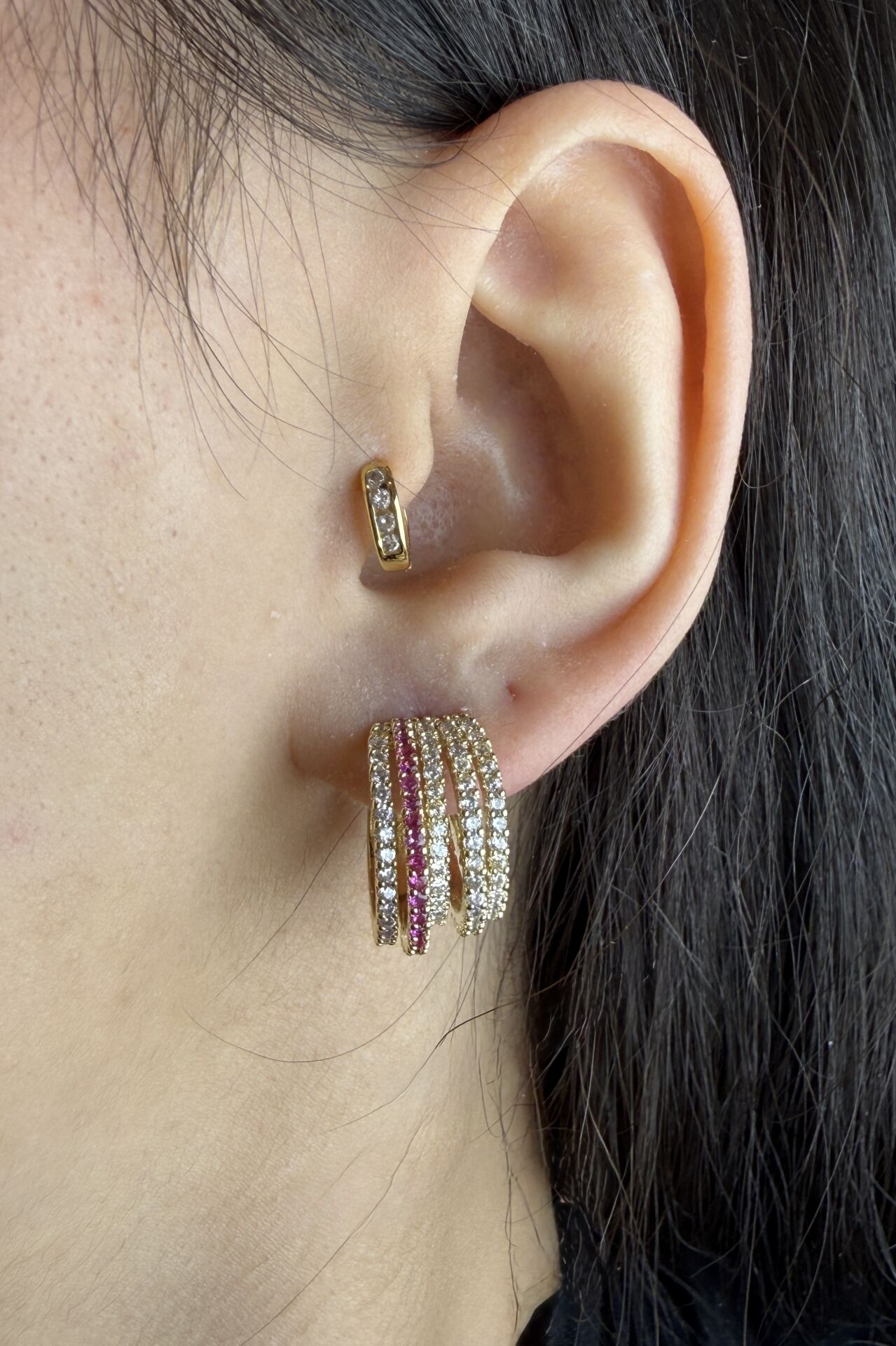 LvLv Gold Rengi Pembe Taş Detaylı Çoklu Görünümlü Zirkon Taşlı Kıvrımlı İğne Küpe