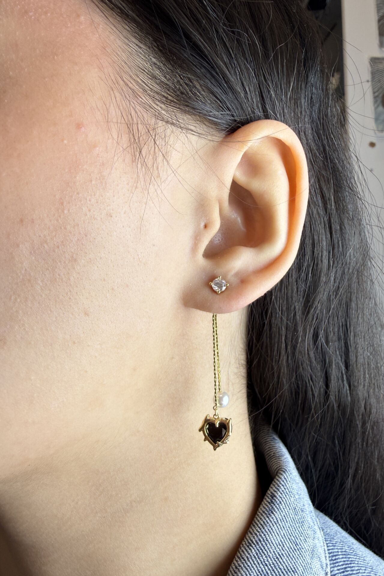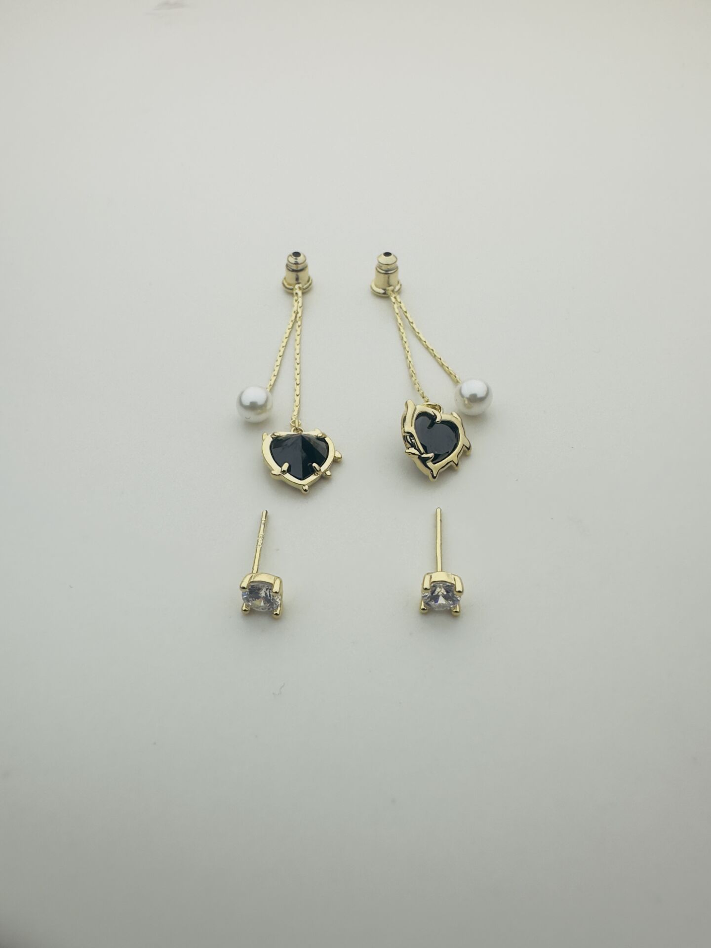 LvLv Gold Rengi Siyah Kalp ve İnci Sallantılı Tektaş Küpe