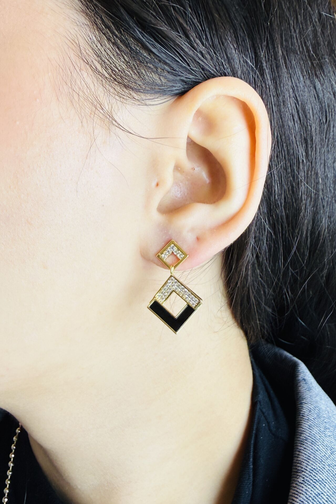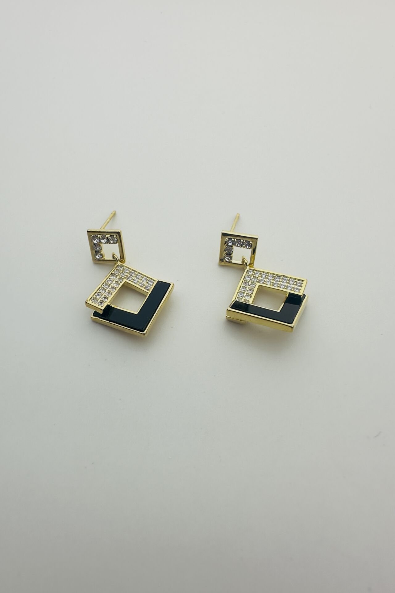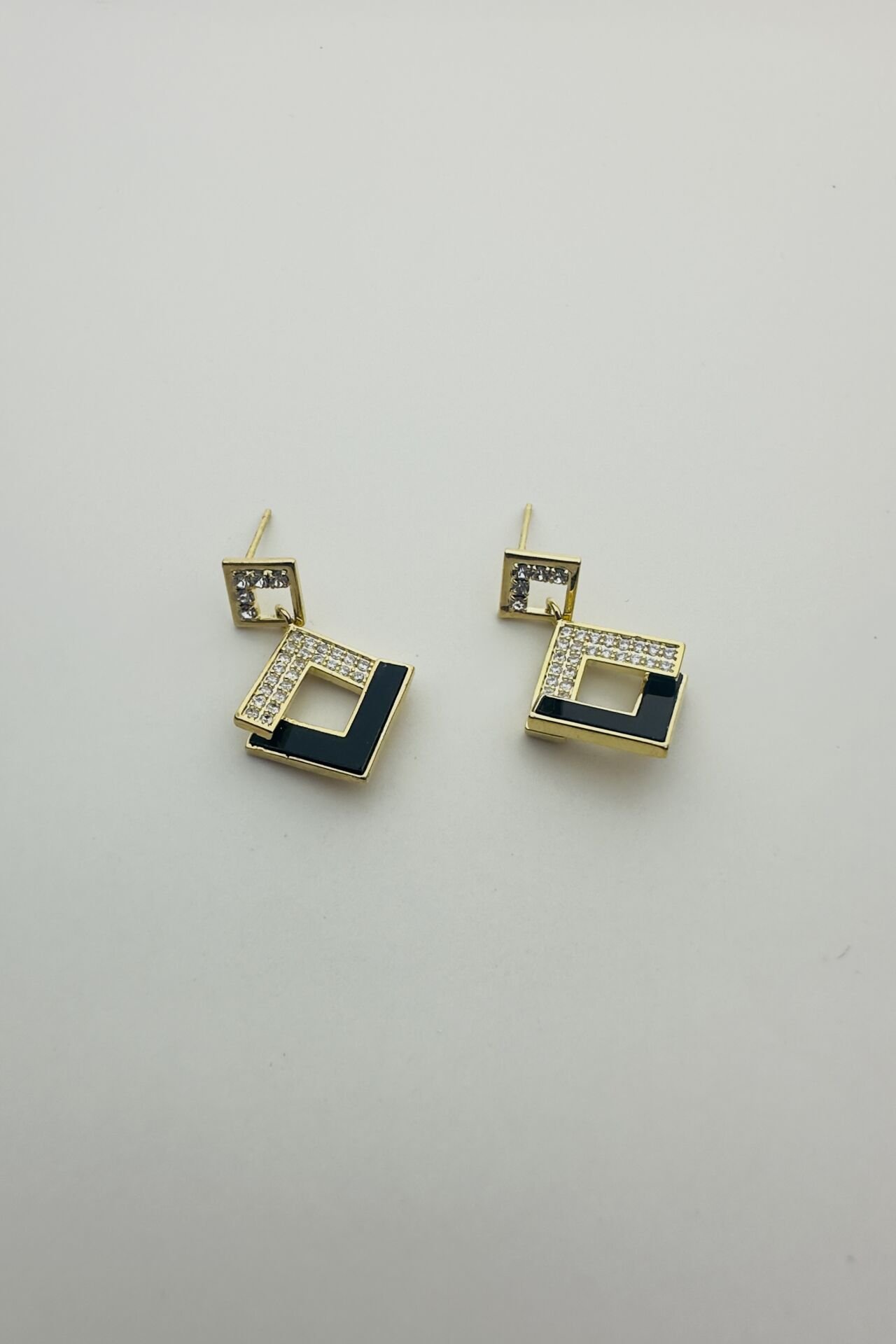 LvLv Gold Rengi Zirkon Taşlı Siyah Mineli Kare Desenli Sallantılı İğne Küpe
